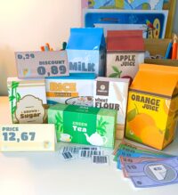 - Pełna i kompletna ZABAWA W SKLEP! Łącznie AŻ 10 produktów: 3x pudełko napoju (sok pomarańczowy, sok jabłkowy, mleko) 4x pudełko produktu spożywczego (cukier brązowy, mąka pszenna, ryż biały, herbata zielona) 1x banknoty do zabawy 2x10, 2x20, 2x50, 2x100 i 2x200 1x kody kreskowe (20 kodów w przynajmniej 5 różnych wersjach) 1x cenówki (5 zwykłych oraz 5 promocyjnych/przecenionych odpowiedników) Zabawa w sklep…