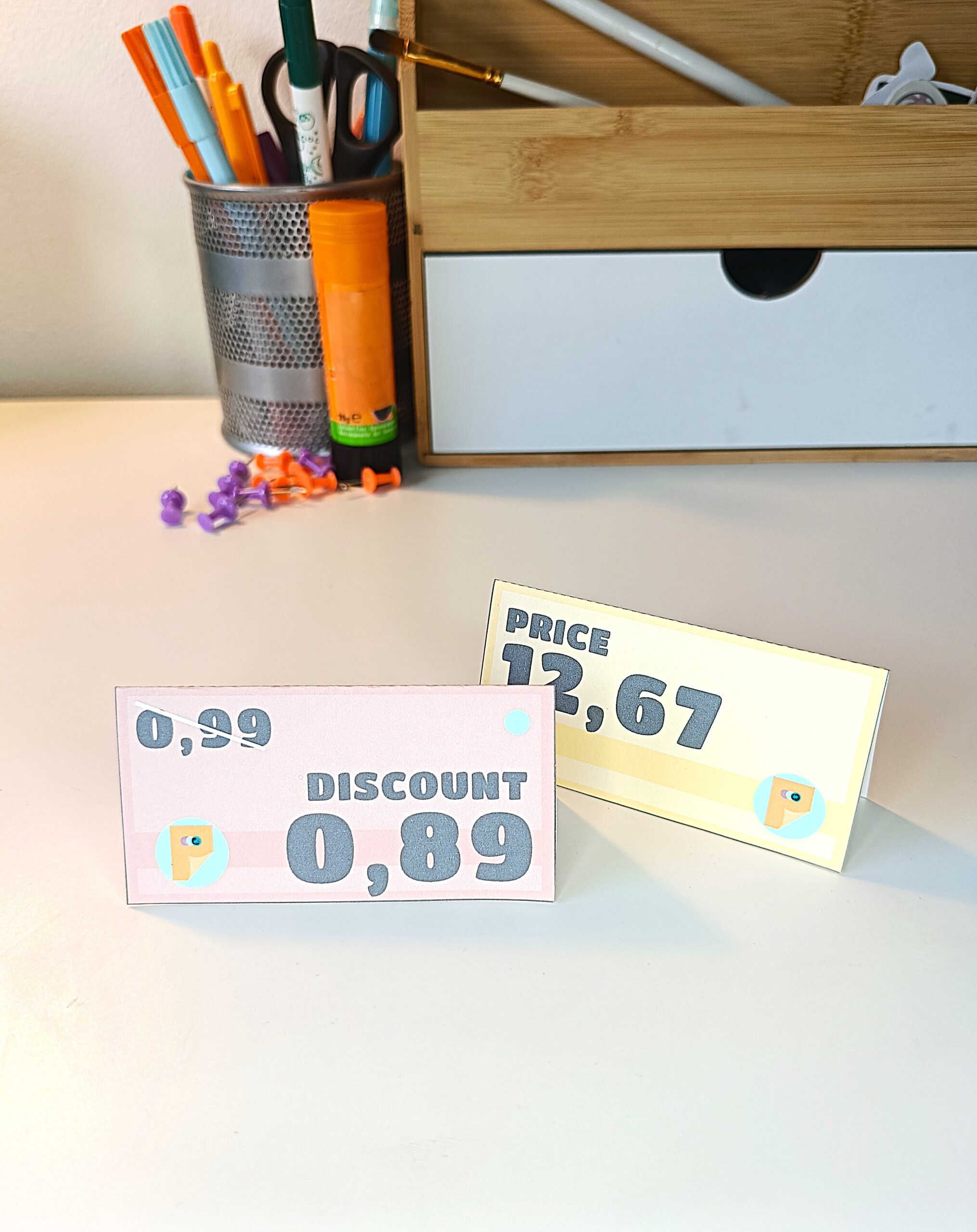 Cenówki są do złożenia na pół i postawienia – można w trakcie zabawy je zamieniać stronami, kiedy Wasz sklep ogłosi wielkie Promocje 🙂