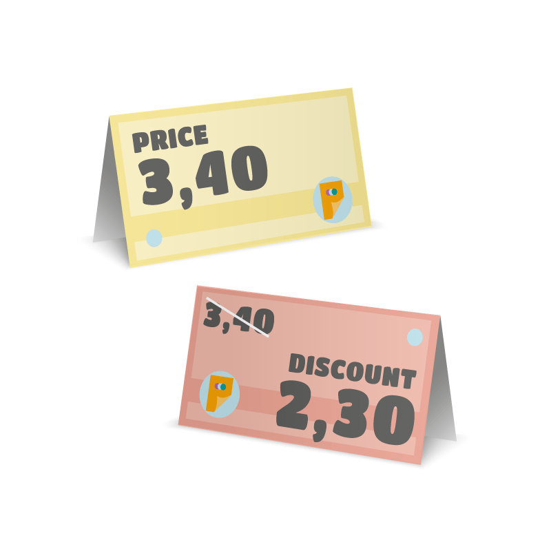 Na adres e-mail, który podasz podczas składania zamówienia, otrzymasz plik PDF do pobrania i samodzielnego wydruku (1 strona A4), a w nim: 6 różnych cenówek do złożenia na pół i postawienia: po jednej stronie znajduje się tzw. ‘regularna’ cena, a po drugiej promocyjny odpowiednik, czyli cena “po obniżce”.