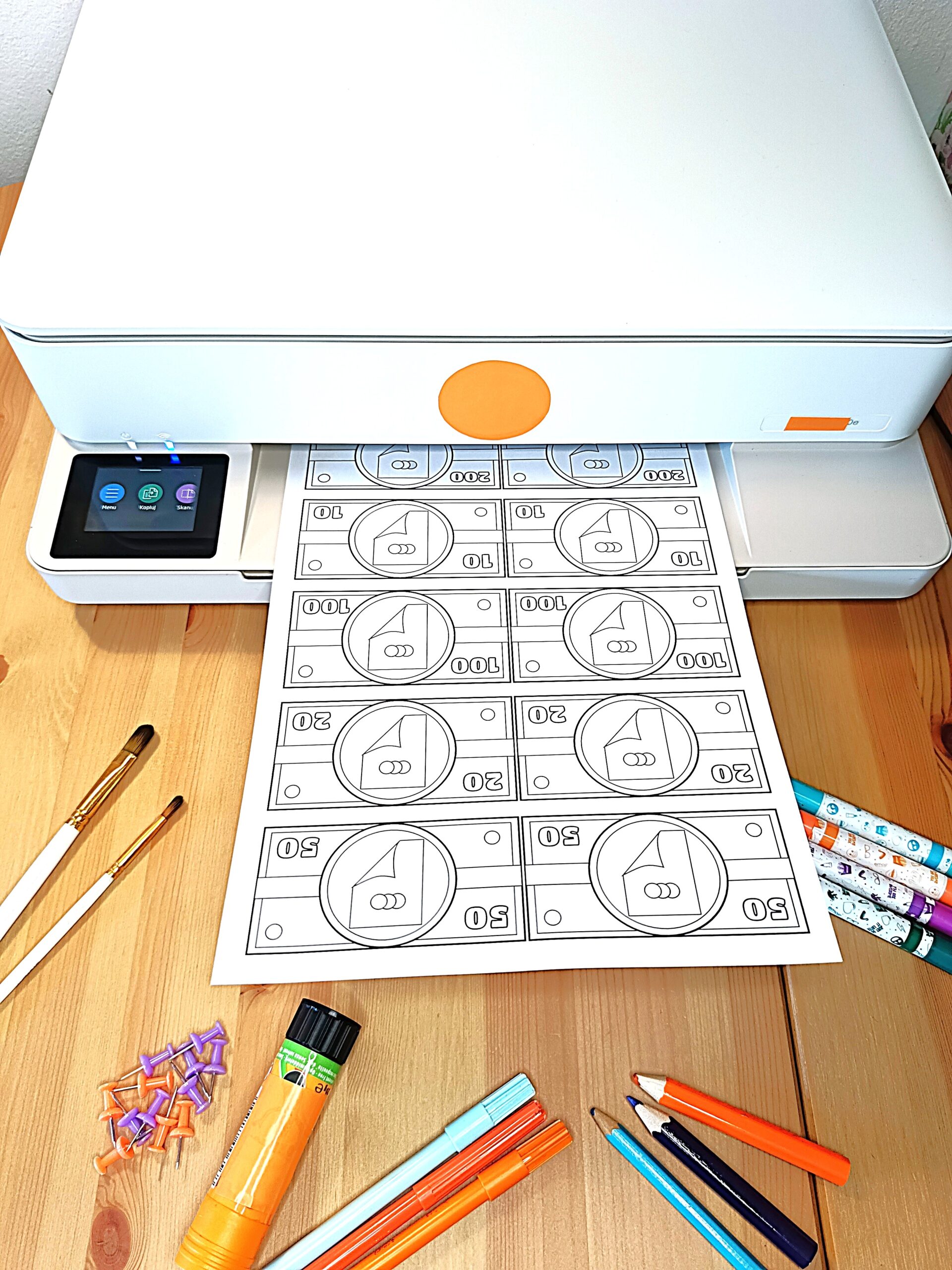 POMYSŁ: Przy wyborze flamastrów i/lub farba wydrukuj banknoty na grubszym papierze (najlepiej w przedziale 160-180 g/m²), żeby się nie rwał i nie pofalował, ani żeby malunki nie przeciekały/prześwitywały na drugą stronę.