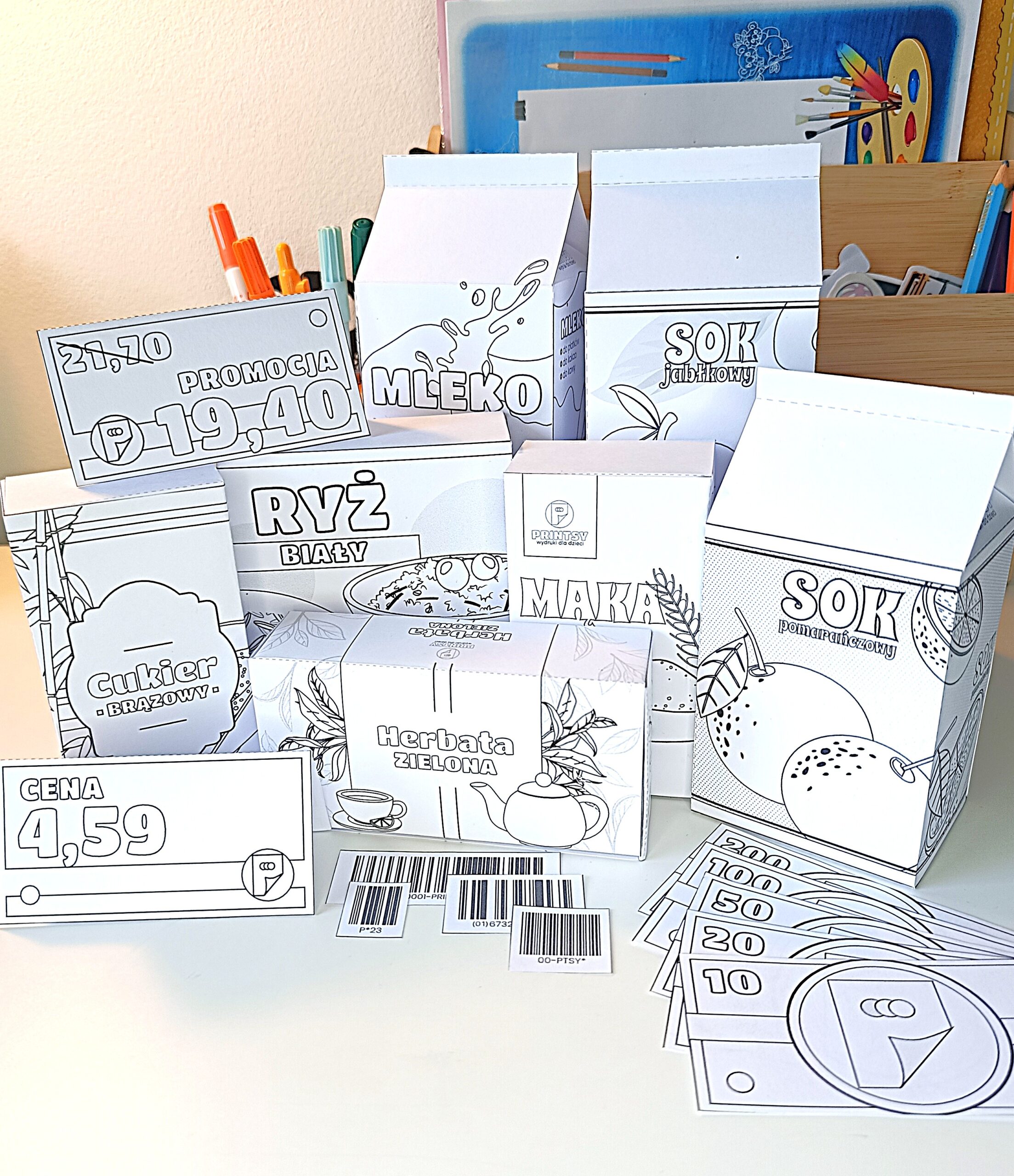 Na adres e-mail, który podasz podczas składania zamówienia, otrzymasz plik PDF do pobrania, samodzielnego wydruku i pokolorowania (1 strona A4, z dwiema kolumnami całego zestawu banknotów, czyli 2×10, 2×20, 2×50, 2×100 i 2×200. Zatem jeśli chcesz np. mieć każdego nominału po 10 sztuk – wydrukuj plik w 5 kopiach.