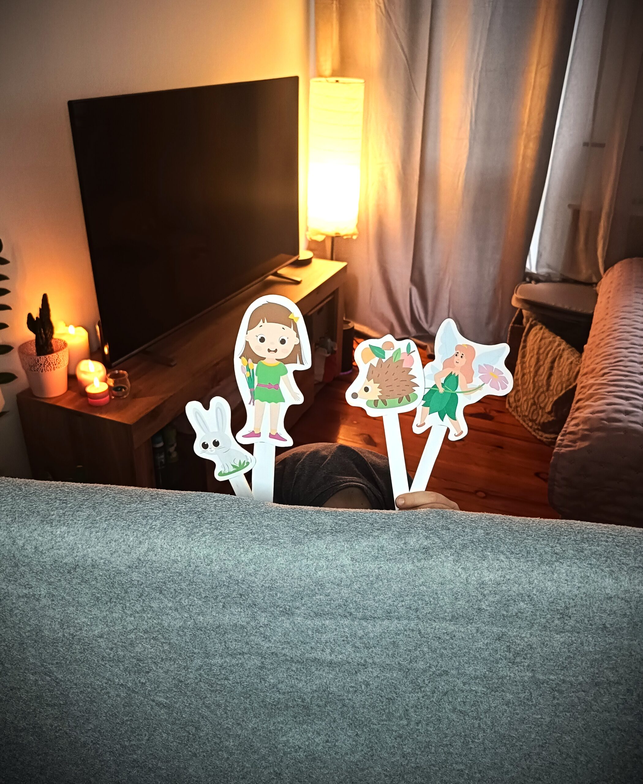POMYSŁ: Oczywiście zawsze najprostszą “sceną” w moim dzieciństwie, były dwa odwrócone krzesła i na nich rozpostarty koc. 🙂 To zawsze się dobrze sprawdzi. Ale jeśli chcecie pójść o krok dalej, zawsze możecie wykorzystać pustą ramkę na zdjęcia – najlepiej nie mniejszą niż A4. Przykleić po bokach ‘kurtynki’ z papieru, bibuły, skrawków materiału. Albo wykorzystajcie puste pudełko kartonowe. Wytnijcie dziurę tylko z przodu oraz z dołu, a na tylnej ściankę możecie wtedy przygotować jeszcze tematyczne tło. 🙂 Niech wyobraźnia i kreatywność będzie z Wami !