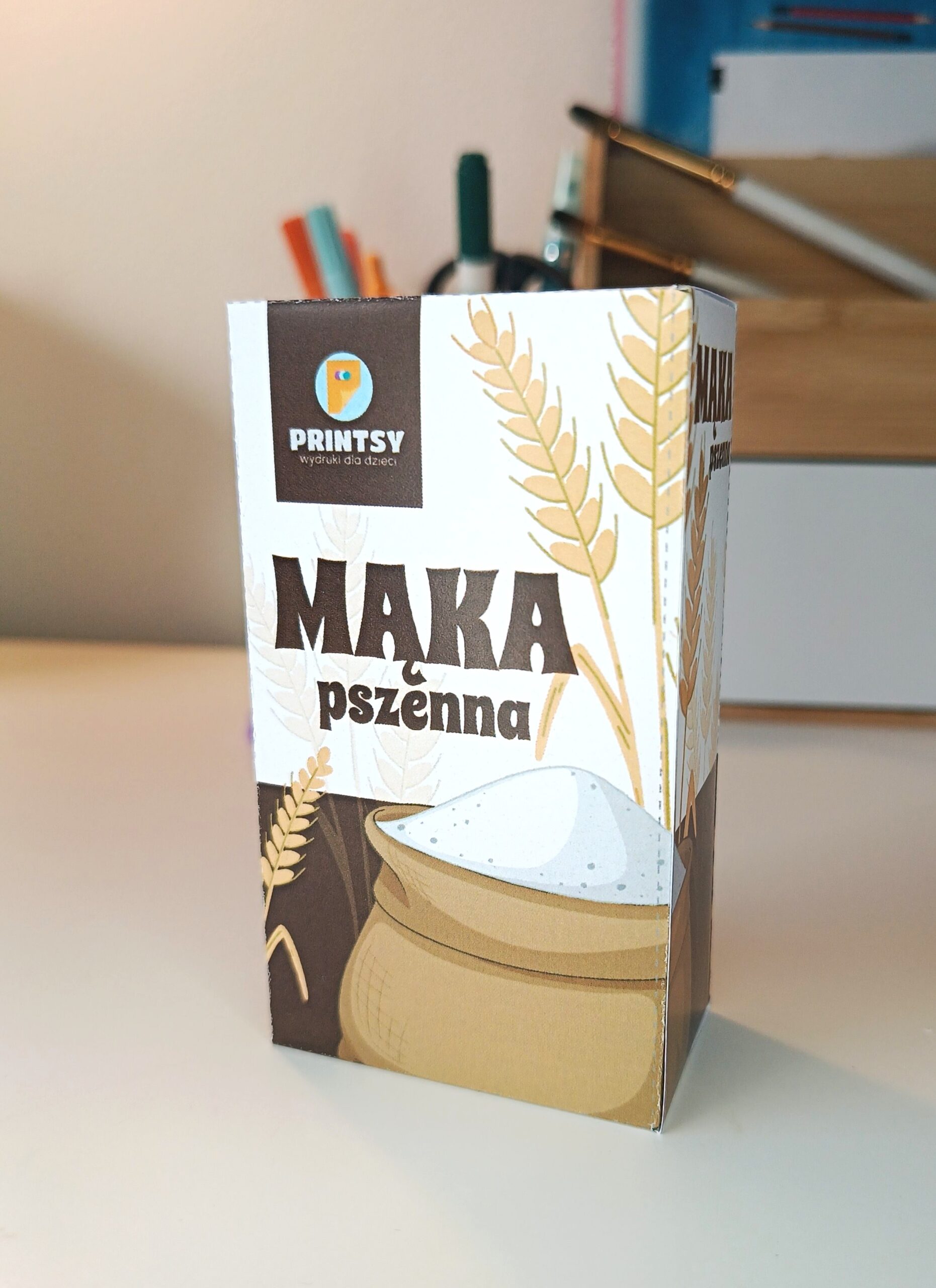 POMYSŁ: Jeśli Twoje dzieci chciałyby mieć oprócz mąki również cukier (oba pudełka mają te same wymiary), ale nie chcą składać obu pudełek – wydrukujcie oba projekty jak zwykle, złóżcie tylko jedno pudełko (np. mąkę), a z drugiego (cukru) wytnijcie tylko prostokątną część z obrazkami i napisami. Następnie naklejcie je na dwóch bokach już złożonego pudełka (cukier na mąkę lub odwrotnie)! Tym sposobem będziecie mieć dwa produkty w jednym. Wystarczy tylko obrócić pudełko, aby uzyskać inny