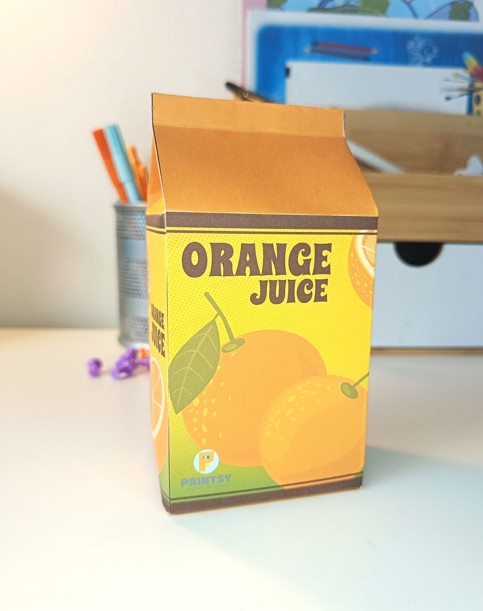 POMYSŁ: Jeśli Twoje dzieci chciałyby mieć i sok jabłkowy i/lub mleko/sok pomarańczowy, ale nie chcą składać dużej ilości pudełek – wydrukujcie projekty tych pudełek jak zwykle, złóżcie tylko jedno pudełko, a z drugiego wytnijcie tylko prostokątną część z obrazkami i napisami. Następnie naklejcie je na dwóch bokach już istniejącego innego pudełka! Tym sposobem będziecie mieć dwa napoje w jednym. Wystarczy tylko obrócić pudełko, aby uzyskać inny napój.