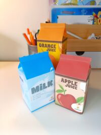 POMYSŁ: Jeśli Twoje dzieci chciałyby mieć te wszystkie 3 napoje, ale nie chcą składać dużej ilości pudełek – wydrukujcie projekty tych pudełek jak zwykle, złóżcie tylko jedno pudełko, a z drugiego wytnijcie tylko prostokątną część z obrazkami i napisami. Następnie naklejcie je na dwóch bokach już istniejącego innego pudełka. 🙂 Tym sposobem będziecie mieć dwa napoje w jednym. Wystarczy tylko obrócić pudełko, aby uzyskać inny napój.