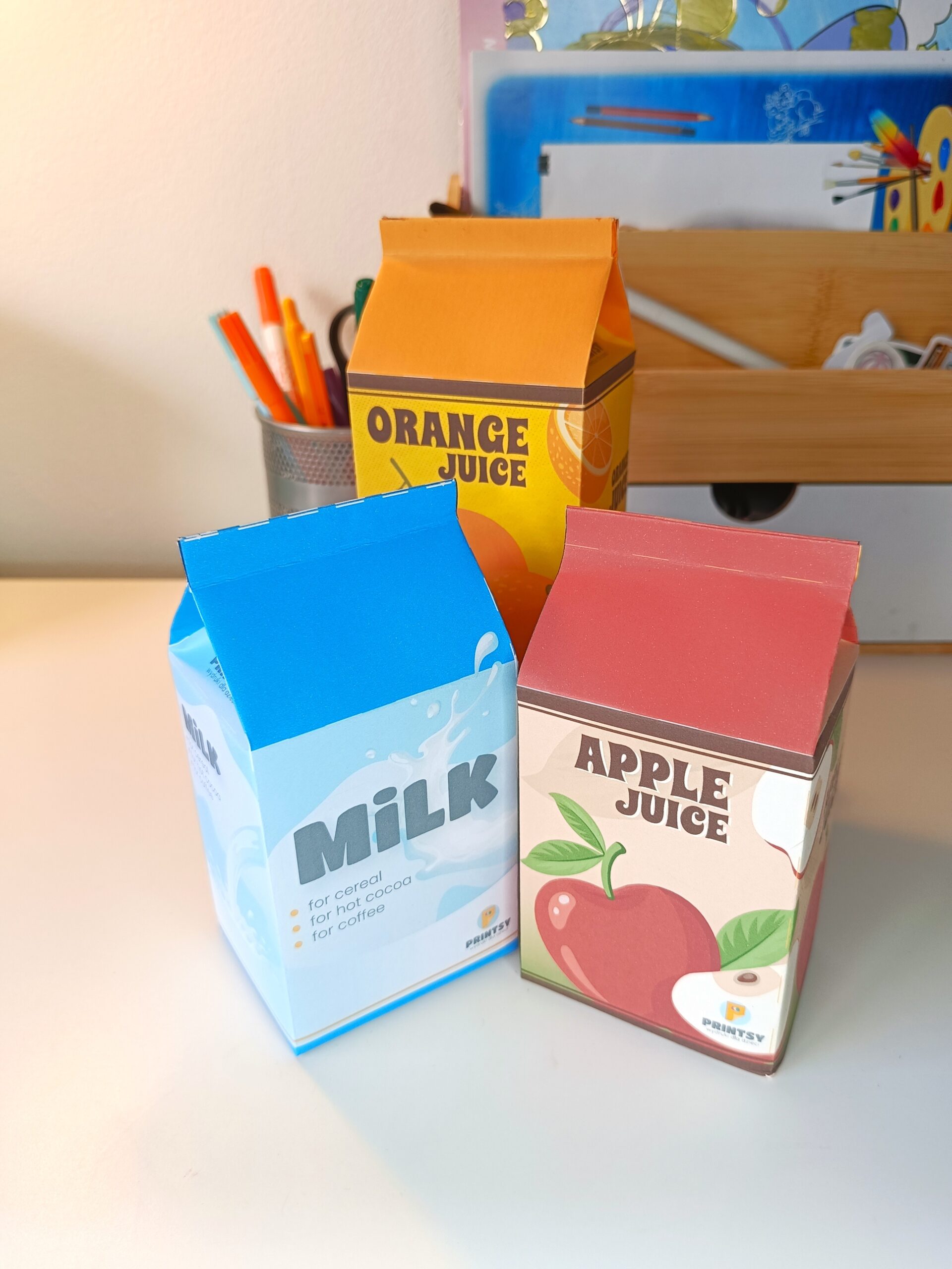 Na adres e-mail, który podasz podczas składania zamówienia, otrzymasz 3 plik PDF do pobrania i samodzielnego wydruku (3 kartki A4: apple juice – sok jabłkowy, orange juice – sok pomarańczowy oraz milk – mleko) oraz jedną, wspólną instrukcję do pudełek (1 kartka A4), aby mieć pewność w jaki sposób je złożyć.